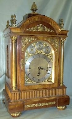 An impressive late 19th century satin wood quarter chiming Bracket Clock. The triple fusee chiming on eight bells, with three subsidiary dials, strike/silent, fast/slow, Westminster/Cambridge. This clock is 24 inches high.
